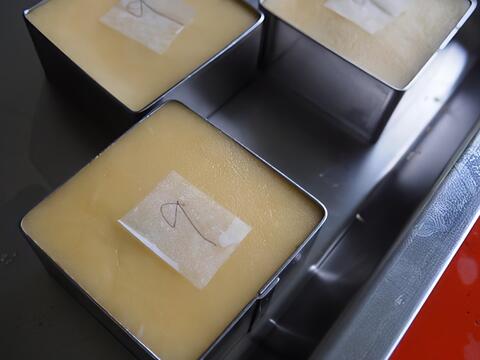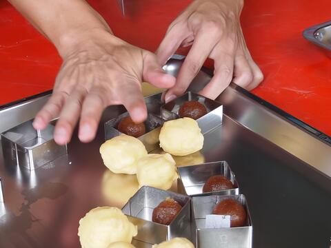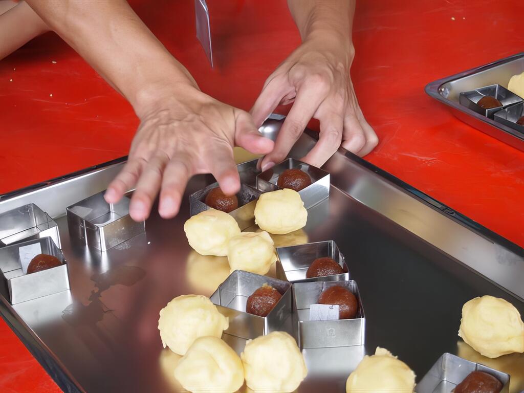 大夥兒依照老師的指令,先將麵粉放在掌心拍平,上面放入內餡,然後將麵粉推上包著,類似包水餃般,接著放入方形模具,再用拇指往下按壓,利用拇指力道往下按壓,同時延著方形模具四邊將麵粉推勻,密合到模具四角為止。標上各自號碼,工作人員將作品拿回餅房烘烤,離開前別忘了將手作鳳梨酥成品帶回家品嘗。