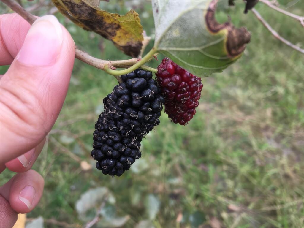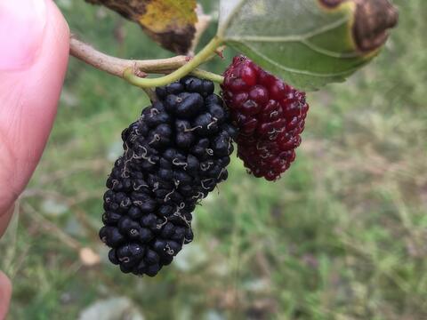 ▲深色桑椹才是熟透的果實,口感微甜;紅色果子則帶酸