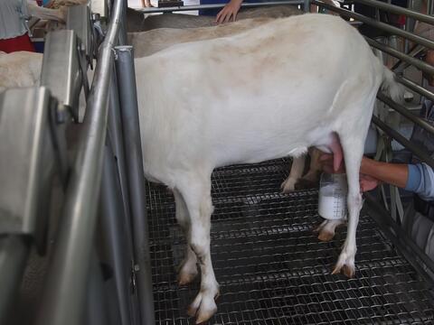 這時農場上演重頭戲「現擠羊奶秀」,別看羊媽媽溫柔的模樣,只見工作人員輕輕一擠,豐沛的羊奶突然間噴射而出,欄杆旁觀看的小朋友差點閃避不及。