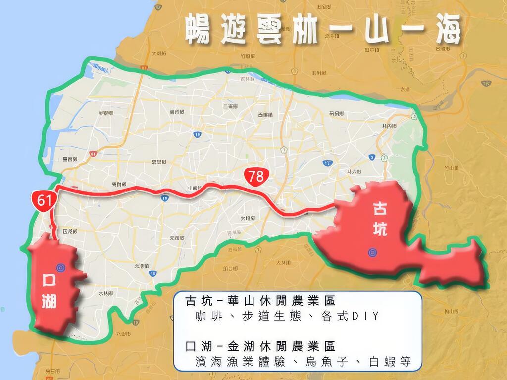 古坑鄉在雲林最東邊,舊稱庵古坑,面積和新北市坪林區相當;口湖鄉位在雲林最西南處,面積只有古坑鄉的一半。