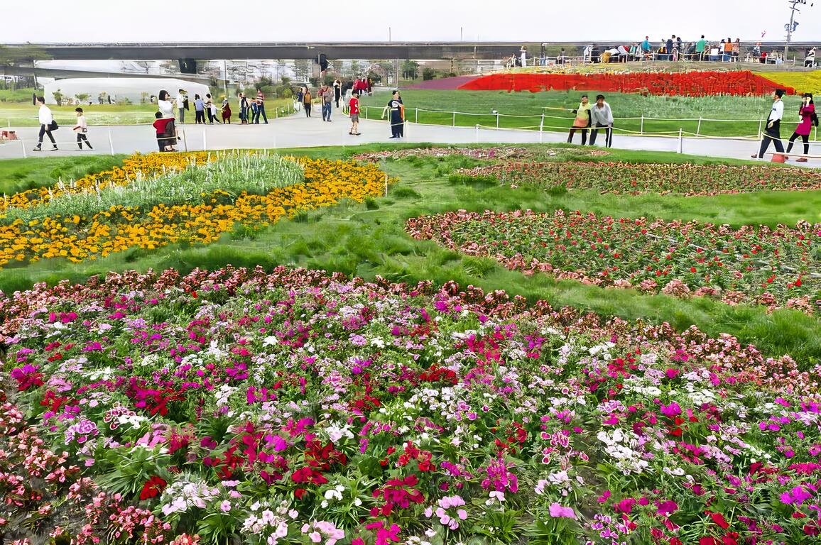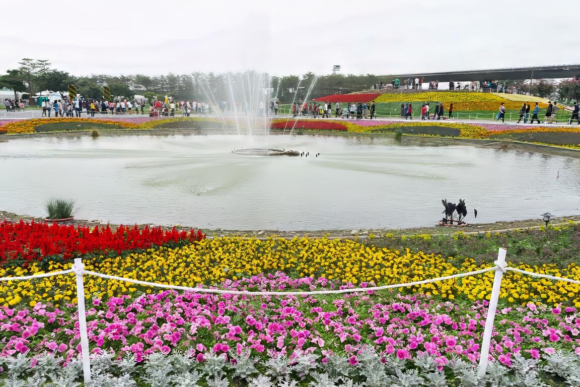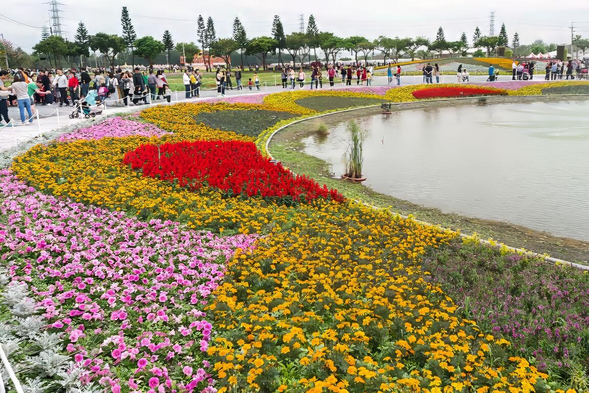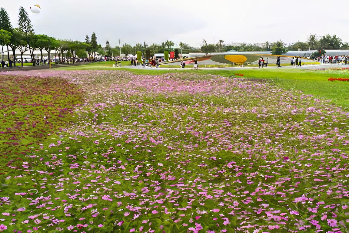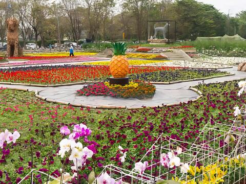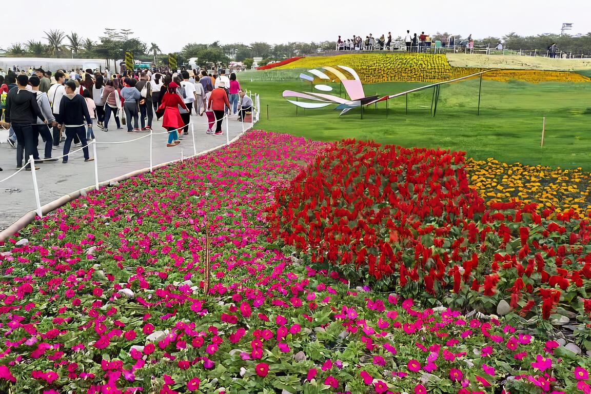 2018屏東熱帶農業博覽會各區皆有特色,除人龍綿延不絕主打重點的「Hello Kitty彩稻田&商品」區外,一開始進入看到的「迎春花海」區一直以來都是遊客最常駐足拍攝的地方。於此並有設置觀景平台,供遊客遠眺整個園區的美景。