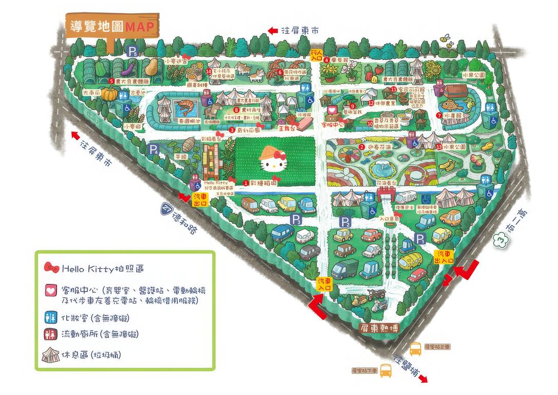 屏東一年一度吸睛的戶外休閒農業旅遊活動,就是位於長治鄉的「屏東熱帶農業博覽會」。除14個主題園區外,去年與國際索尼影業公司【惡靈古堡:最終章】合作的彩繪稻田,今年2018年以【Hello Kitty】彩繪稻田為主題,再搭配壯觀的花海,配合14個主題園區,是個適合家族旅遊的好去處。