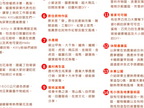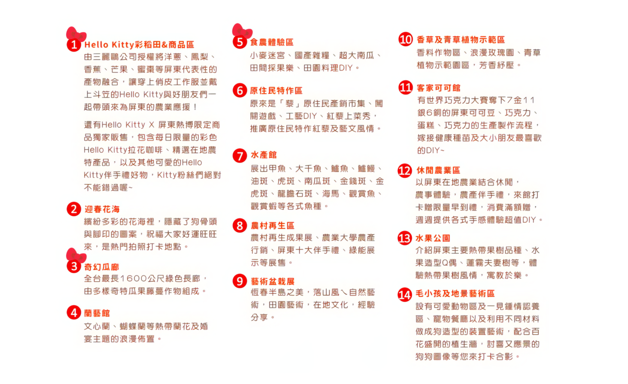 1.彩繪稻田。2.迎春花海。3.奇幻瓜廊。4.蘭藝風情館。5.食農體驗。6.水族館。7.原民特作區。8.香草浪漫物語。9.藝術盆栽展。10.熱帶農村。11.可可情人館。12.休閒農業。13.可愛毛小孩。14.水果公園。