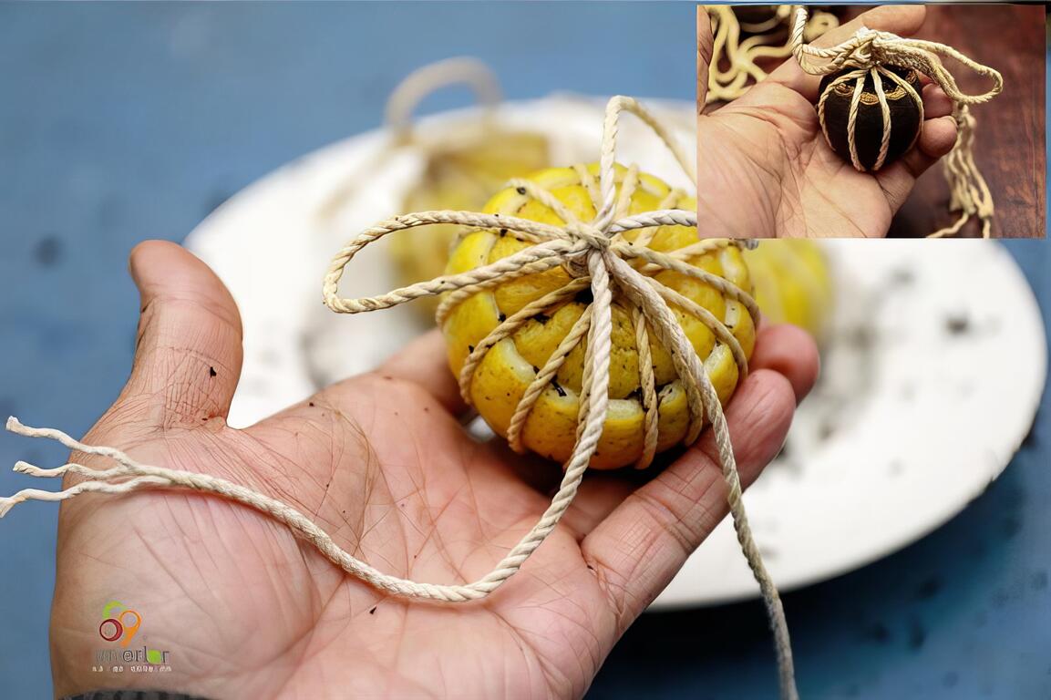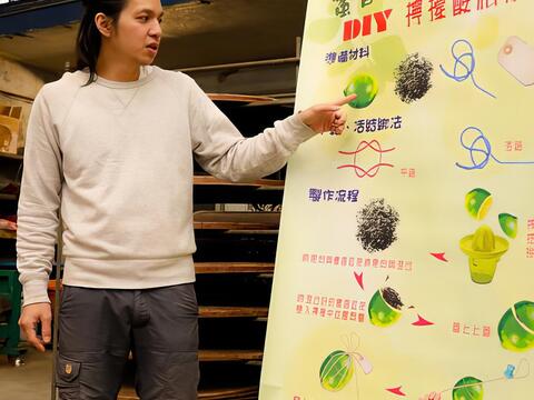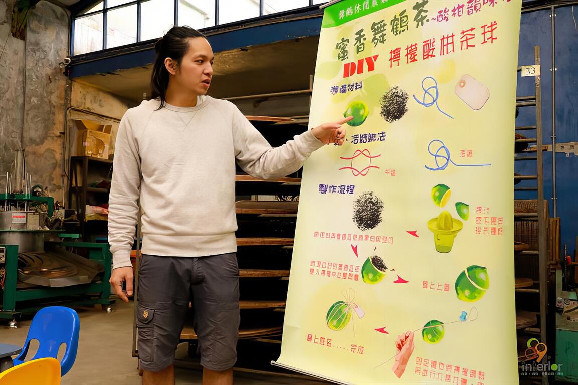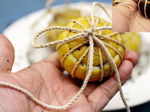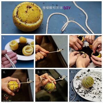 以「舞鶴蜜香紅茶」來製作成客家特色「檸檬酸柑茶」, 感覺還挺有特色的。在參觀過吉林茶園, 了解到蜜香紅茶樹種, 以及發現到小綠葉蟬的蹤跡。回到茶廠, 我們要開始來體驗「檸檬酸柑茶」 DIY。首先將檸檬洗淨如圖示切開, 挖出果肉並將籽去除, 將果肉與蜜香紅茶茶葉混合備用。製作檸檬酸柑茶球, 可以使用鐵絲或是棉繩, DIY老師建議使用棉繩比較好操作。1.先將混合的檸檬果肉茶葉塞入檸檬杯中(必須將其壓緊實)2. 蓋上檸檬杯蓋並將其塞入杯中 3.將棉繩一頭穿過桌面的孔(這是方便施力時容易綑緊棉繩)4. 將棉繩依序如圖示環繞檸檬呈十字交錯, 透過平結與活結的綁法將檸檬綑緊 5. 完成後還要經過數次烘乾與重新綑綁才算是完成品喔。