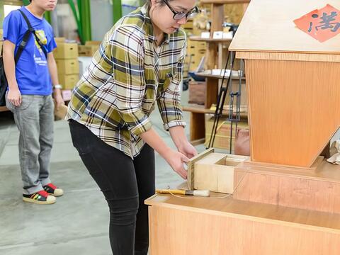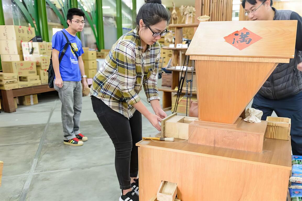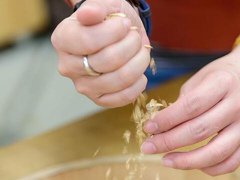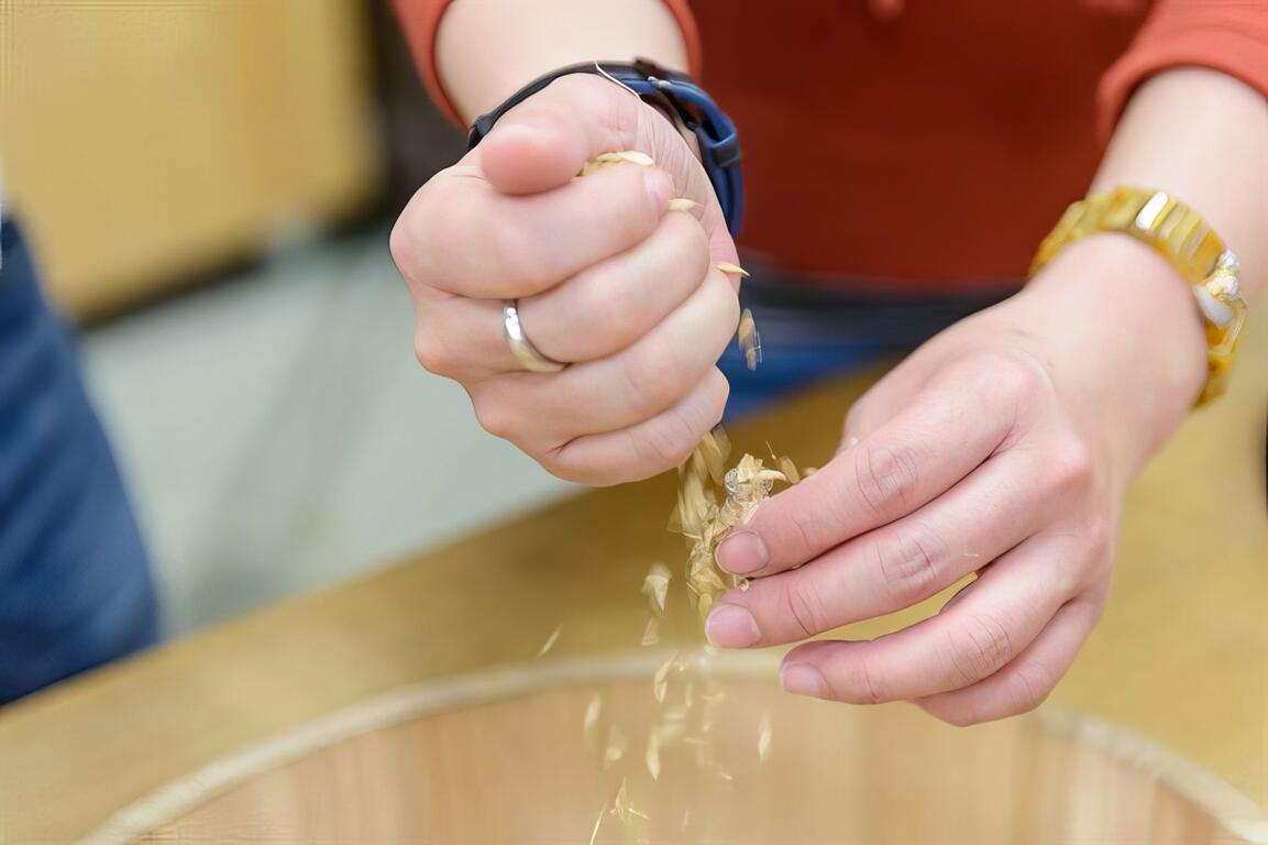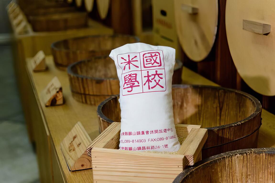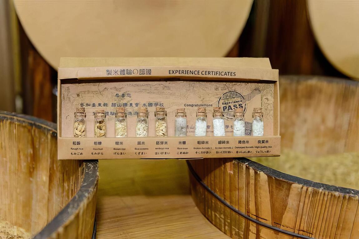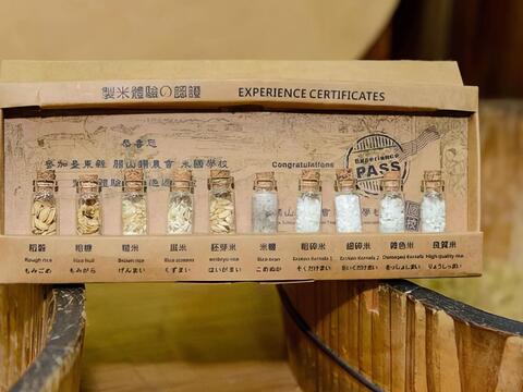 大米課程帶您瞭解稻穀、以及如何裝一斗白米回家。米國學校內的一排木桶內盛著各種稻穀,可以親手摸摸穀粒的模樣,同時裝瓶完成自己的小作業。
