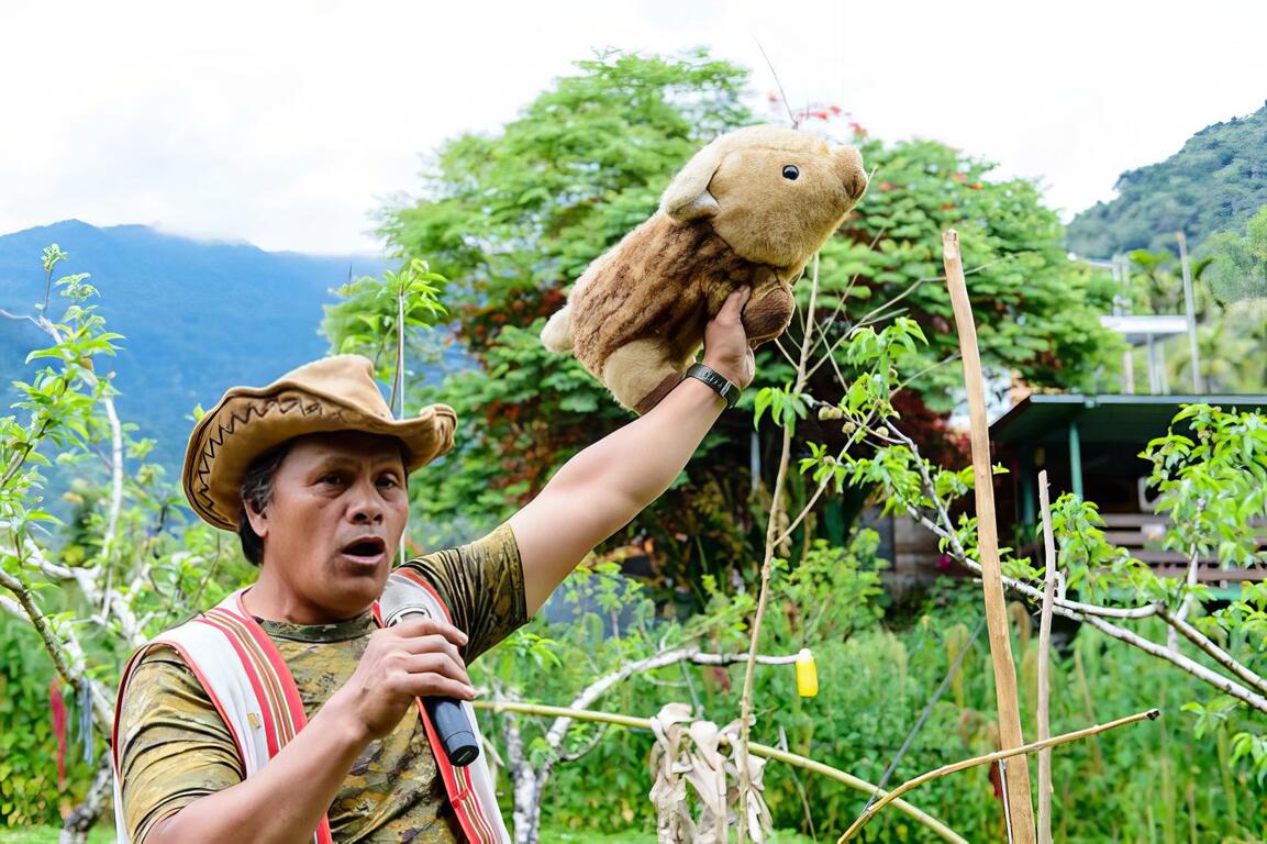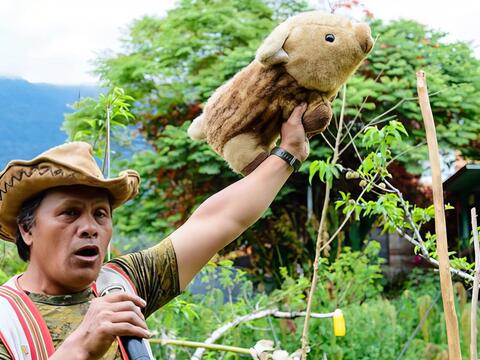 圖說:馬提亞向隔壁借來一隻山豬,示範如何設陷阱。