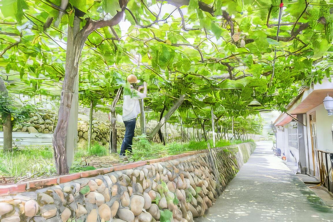 圖說:葡萄舉手可及,老藤遮蔭,七月中採收前會很漂亮。