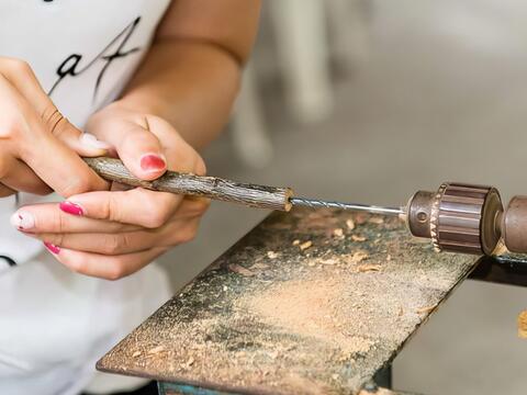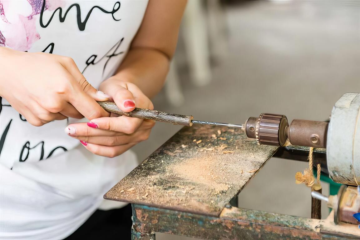 做筆步驟並不難,挑選一支與自己一見鍾情的筆桿最花時間,選好後對準樹枝中心點鑽孔,沾膠上墨條作成筆心,再操刀細心削筆。如果送筆有特別用意,還可以在筆桿上刻字。