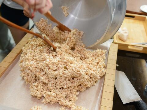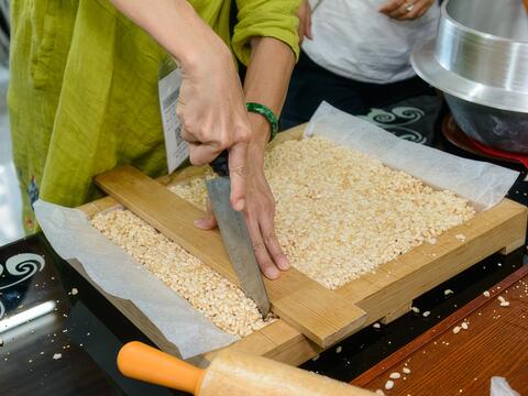 掌握時間是最大的考驗,只要一猶豫就有可能會失敗,正因如此,一大群人帶點手忙腳亂,邊做邊看著米香逐漸成型,心中帶有期待與興奮,樂趣自然多。這個活動適合大人小孩一起動手同樂,不僅享受親子時光,又能品嘗到米香的美味。