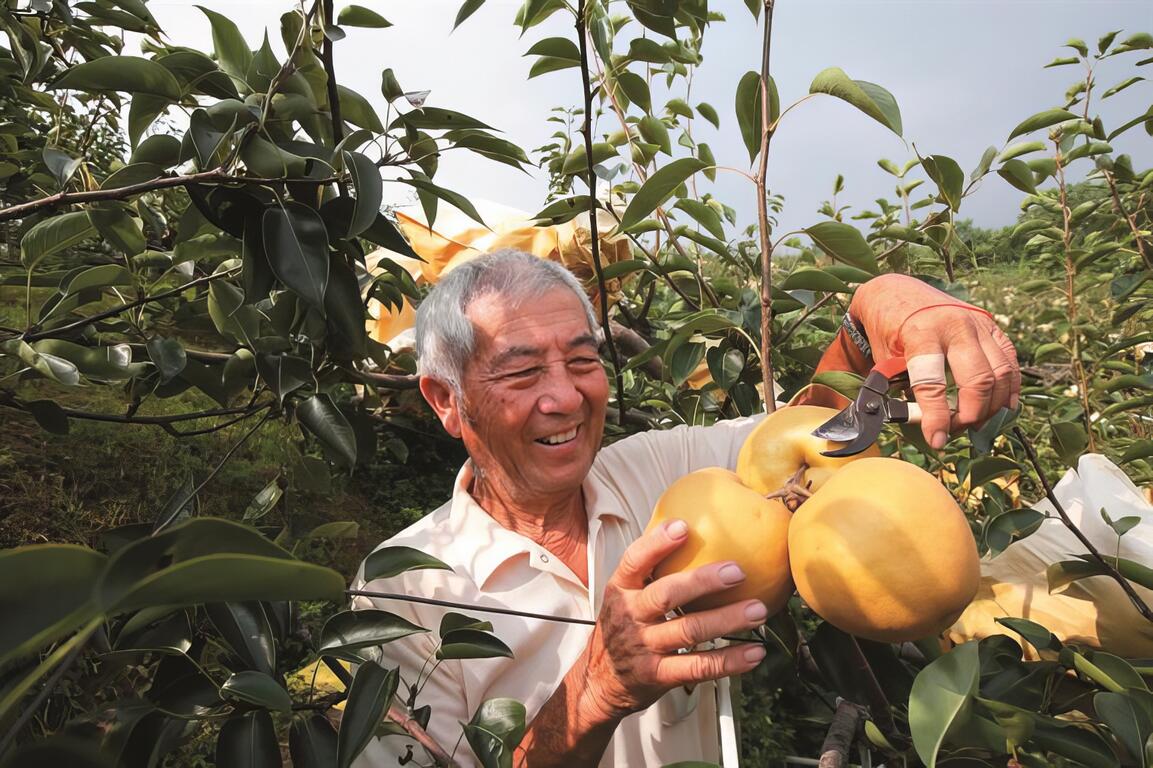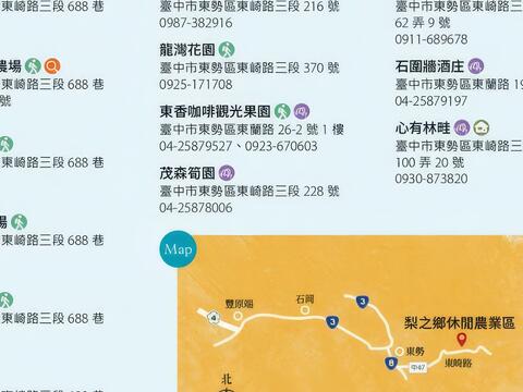 有「水果之鄉」之稱的東勢,氣候溫和、雨水充足、早晚溫差大,果樹在白天裡進行光合作用、吸收養分,到了夜晚氣溫下降,生長趨緩,讓果實蓄積了更多糖分,因而孕育出品質優良的水果。1970年代,東勢退休老師張榕生將梨山的新世紀梨梨穗,高接到平地的橫山梨樹上,讓橫山梨樹長出肉質細緻、甜度高、收益佳的高接梨,他無私地與在地農民享、推廣了這項高接梨技術,開啟東勢的高接梨產業。如今來到梨之鄉休閒農業區,滿山遍野的梨樹各展姿態,初春時梨花盛開,潔白勝雪;仲夏時梨子成熟,結實纍纍掛滿枝頭,發出甜蜜的呼喚,盛邀遊客來嘗嘗最甜美多汁的梨子。