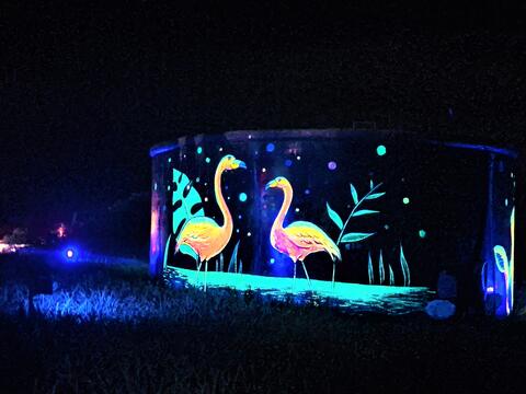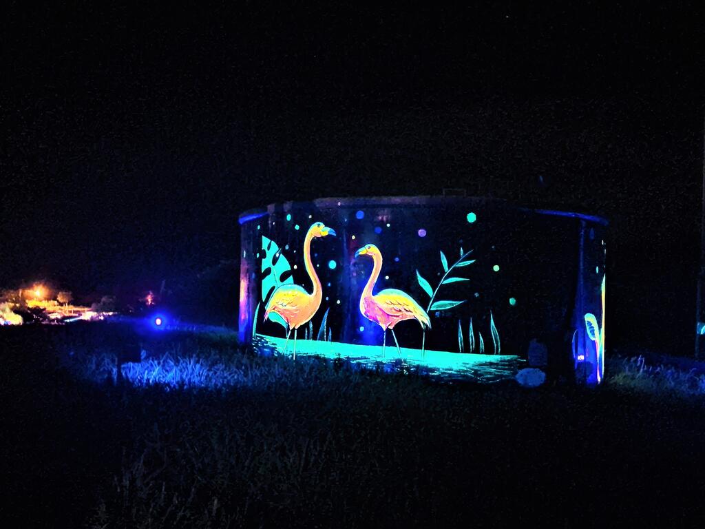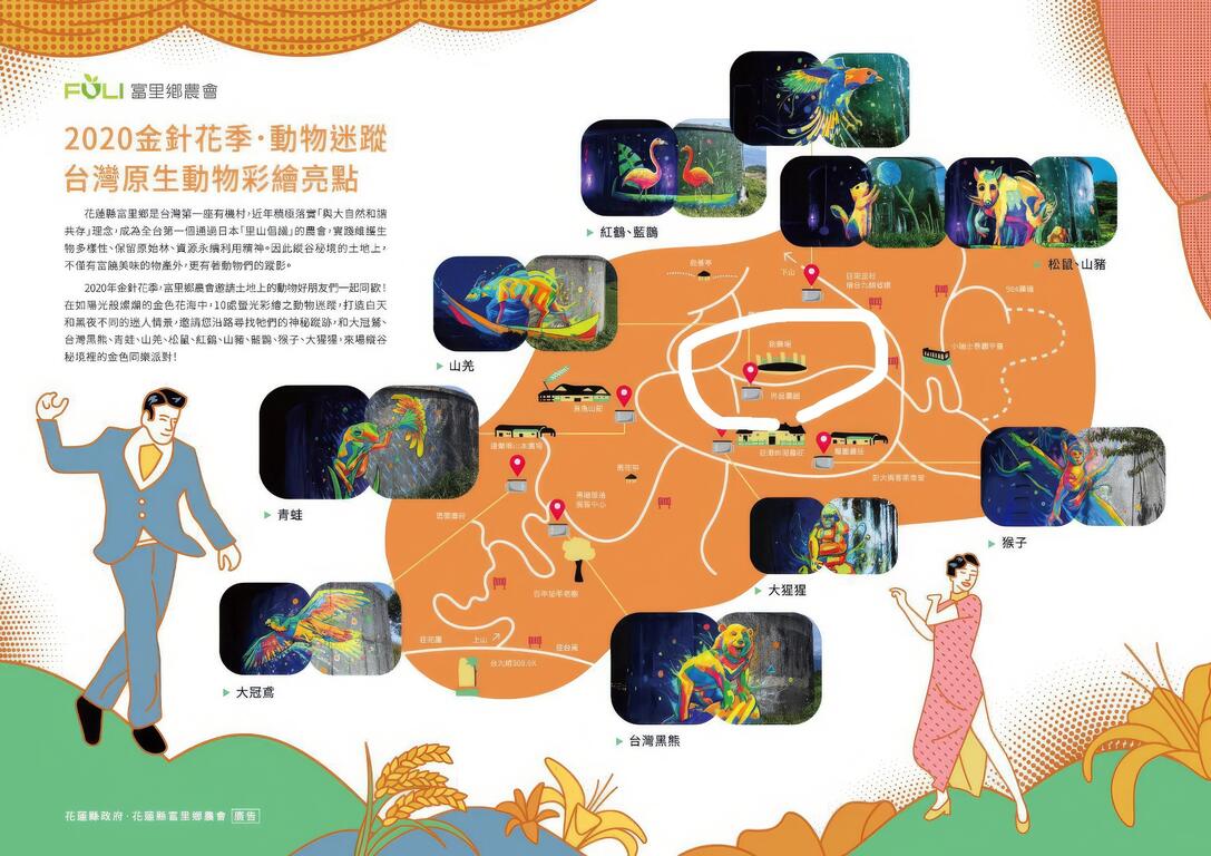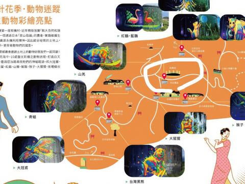 今年六十石山的亮點活動「星光 DISCO .忘憂 AGOGO」,除了在白天可以一覽金針花的美景,還可以在夜晚的星空下欣賞螢光彩繪水塔。「金針花季動物迷蹤」這次在六十石山沿路的水塔上面都畫上了在地時常出現的動物,有山羌、山豬、樹蛙等十種動物。每個在夜晚裡都閃爍動人,等你來發掘。建議可以尋著地圖的路線上走,不然再沒有路燈的夜晚,很容易迷路啊!是不是有點像是尋寶呢?趕快來一趟六十石山吧!