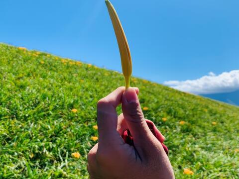 老闆也教了一些採金針花的小技巧,採金針要選的是一日花(即隔一日會開花的花蕾),這是為了方便採收操作,也比較不會沾染花粉。挑選時要怎麼分辨呢?就找已經呈現金黃色的花苞,並從尾巴的根部一起折起就行啦!