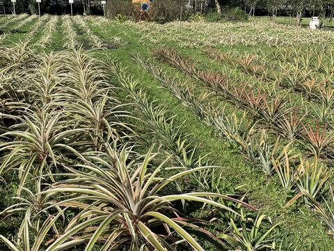園區的一隅,可以看到草地冒出一株一株鳳梨的冠葉,這邊種滿各種不同的鳳梨,有平常吃的金鑽鳳梨,或是小巧可愛的香水鳳梨,也有觀賞用的五彩鳳梨,從葉子的大小與顏色就可以分辨各種品種。這塊小小的鳳梨田,就像是鳳梨家庭族譜,帶著民眾一探鳳梨的身世祕密