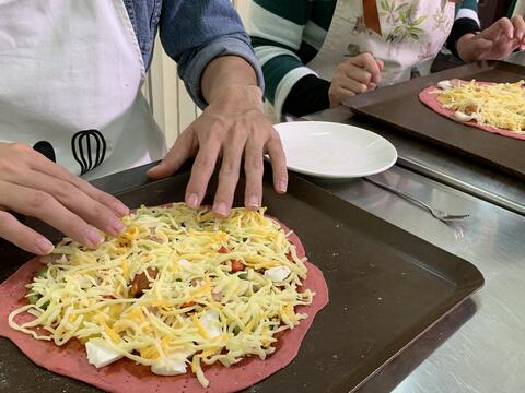 體驗過程中,小老師會細心帶領大家,只要跟著老師的步驟,就不會有問題啦!從桿麵團、抹上番茄醬、擺上配料與起司,操作起來簡單沒有障礙,還樂趣無窮,感覺就像是在紙上作畫,創造屬於自己的藝術品。接下來放入烤箱10分鐘,等候香酥可口的披薩出爐。