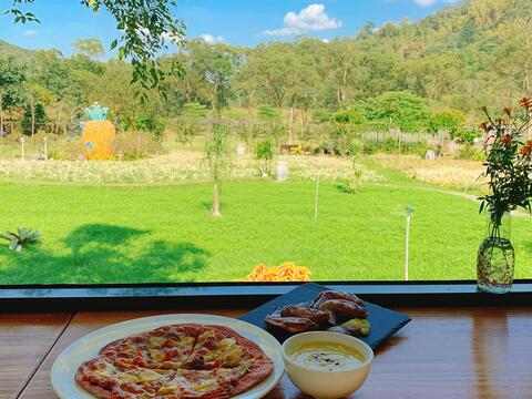 做完Pizza可以到玻璃屋,這時會送上銘泉自己壓製的鳳梨汁與玉米濃湯,酸甜又消暑,喝完一杯還會想要一杯, 停不下來。這時做好的Pizza送上,熱氣騰騰,周圍還散發著誘人的香氣,配上鳳梨汁或是玉米濃湯,就是一頓豐盛的鳳梨饗宴。享受美食之餘還可以遠望迷人的山景,幸運的話可以看到大冠鷲在天空中翱翔,守護著鳳梨田。屏東有機小旅行的第一站就在美食與自然的圍繞下,畫上完美的句點。