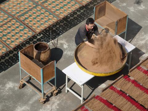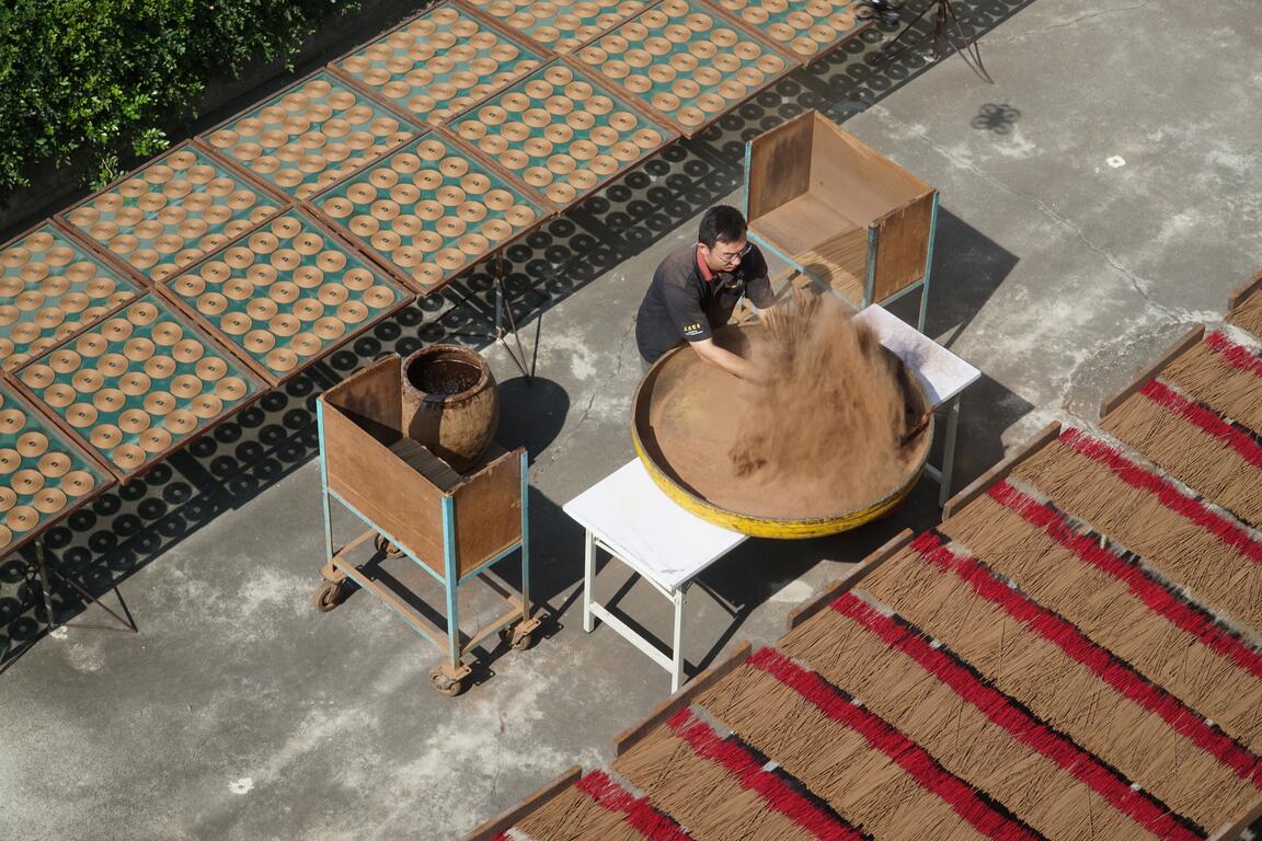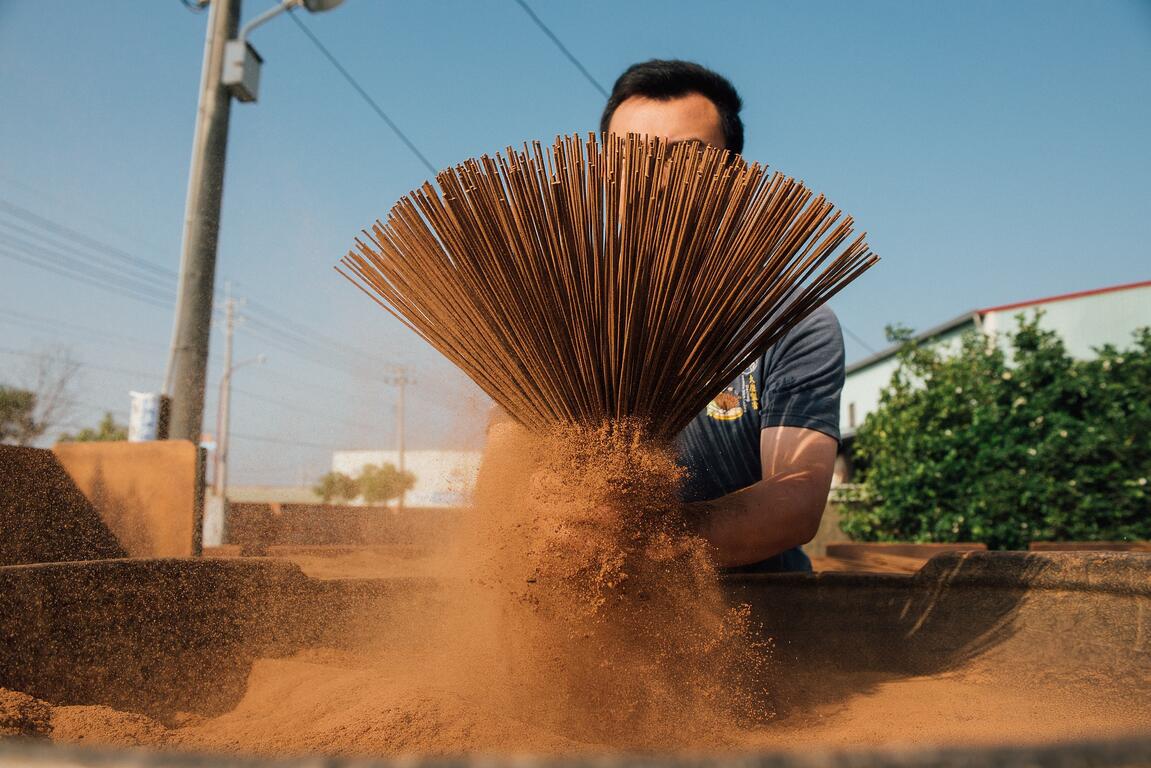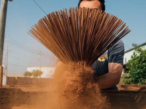 百年老店「大慶製香」,香氣故事從一百五十年前幽幽點起,家族一代代人接續傳承。俐落地將竹芯進水,調好第一層的黏土打底,再將一隻隻竹芯裹上香粉,師傅老練的手沒有停歇,往往自己也被香粉裹得一身。在架子上披香陰乾,在院子裡日照曬香。