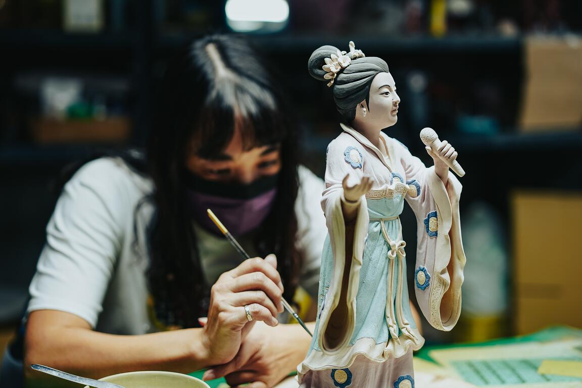 隔著玻璃窗,看工藝師專注地以「捏、堆、塑、貼、刻、劃」六大技巧塑形,刷上漂亮的釉色、經過釉燒,成為廟宇中色彩溫潤繽紛的交趾陶。玻璃窗外,遊人以不同的馬賽克拼磚,體驗剪黏獨特的設計與鑲嵌藝術。