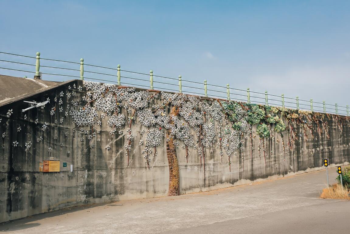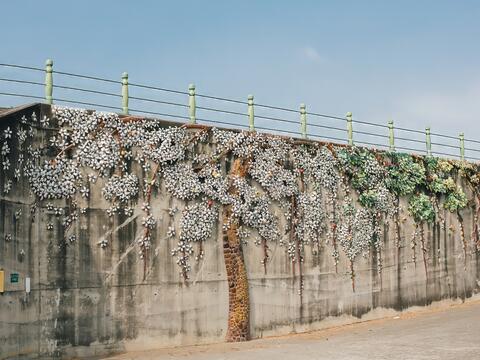這樣的畫面被捕捉下來,成為在地的鮮明記憶,社區結合交趾陶及剪黏藝術,和苦楝變化多姿的四季,以堤防為揮灑的畫布,蒐集上百個酒甕和兩萬多個碗公,創作大型的作品《原鄉四季》。
