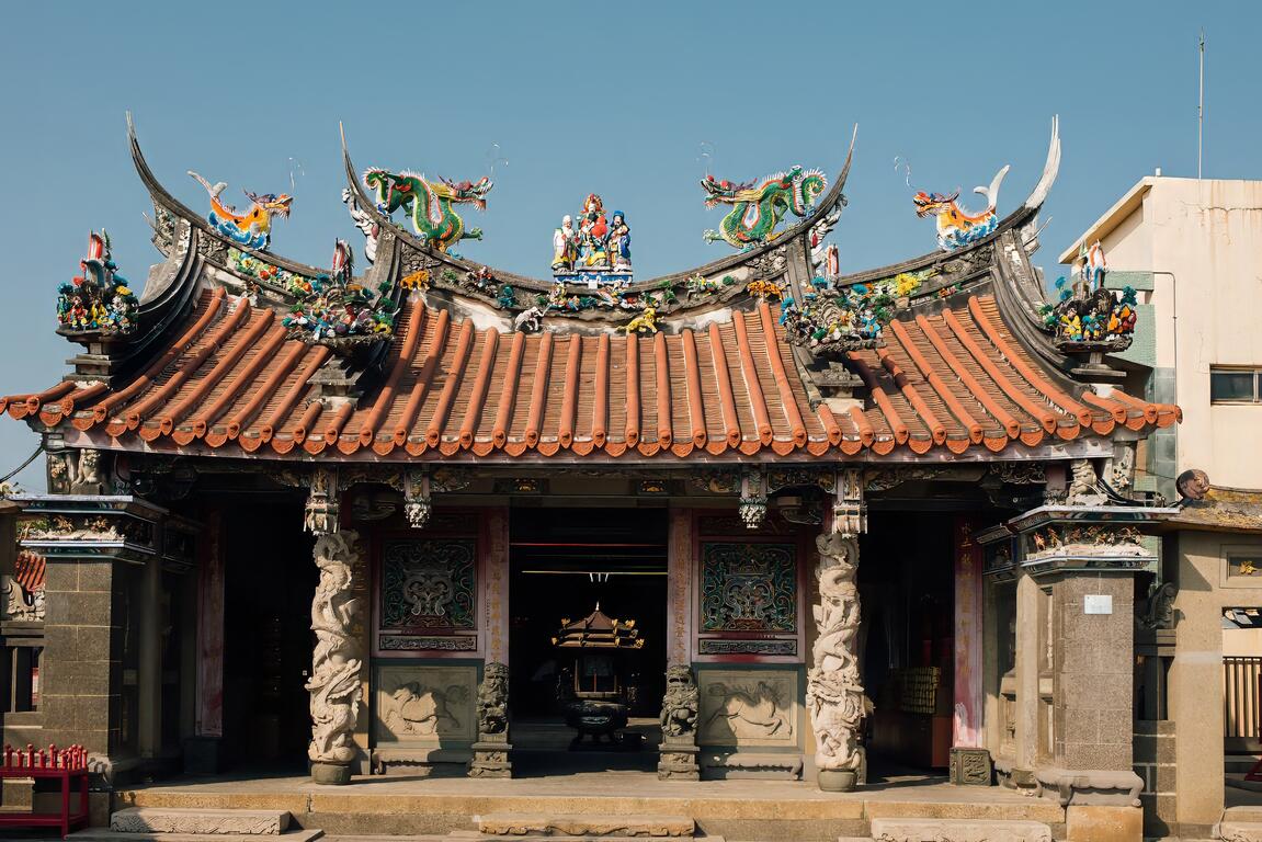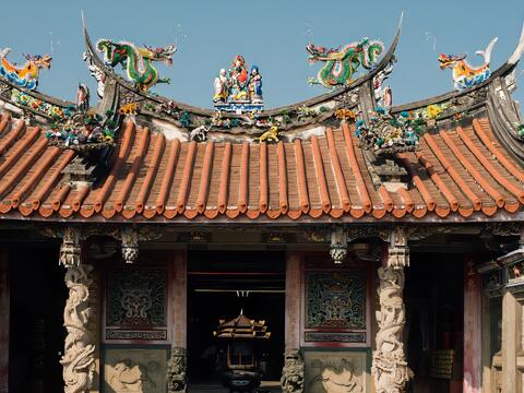 而抬頭凝神細看,也處處是精細的剪黏和交趾陶作品,工藝和古廟交融一起,令人再三駐足,在黃昏的光線之中,讓光陰淡淡走過。