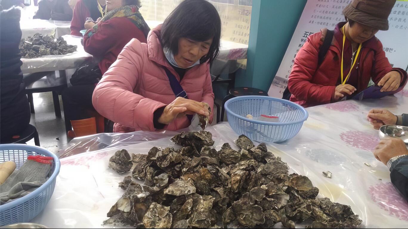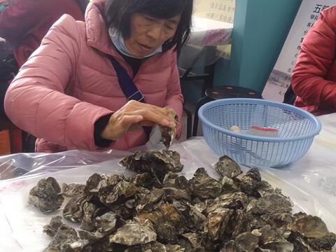 3.體驗剝蚵。無經驗者,請將蚵殼靠在桌上,固定好不要移動。
