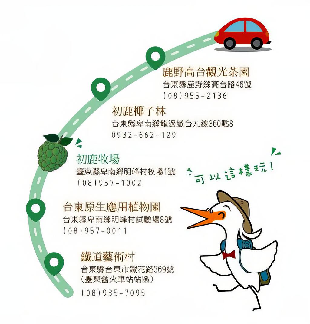 其實不是整個台東都適合釋迦,它仍有其環境與氣候限制,但一般公認台東釋迦最佳產地之一就在初鹿。目前椰子林除了椰子與釋迦外,並種有老薑、文旦、火龍果、枇杷,均採友善農法。每年9到12月可以自採傳統釋迦,12月到4月可採鳳梨釋迦。