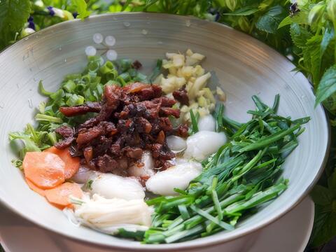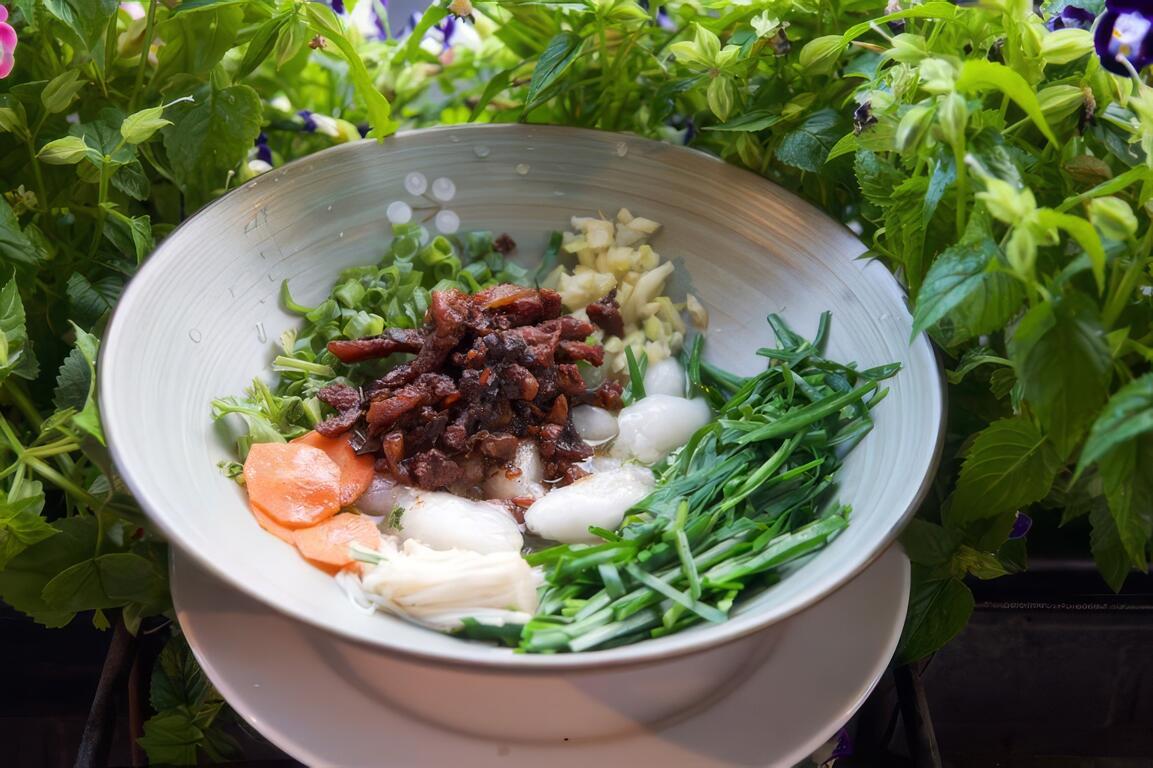 最招牌是「起飛雲朵」。那是早年在農地清苦耕作時,涂媽媽會隨手用太白粉捏成麵疙瘩,煮熟後拌點白糖給小朋友當點心止饑,那麵疙瘩捏得很不規則,就像天上的雲朵。涂家小孩長大後,就用這雲朵加上一點爆炒的客家肉絲、一點韭菜、芹菜、香菜、蔥花與幾片紅蘿蔔,就這樣,沒有值得炫耀的難得食材,也沒有吹噓熬了幾天幾夜的高湯,但入口之後,就是扎扎實實傳統客家鹹湯圓那股濃郁鹹香,就是咀嚼起來會把笑容都給彈出來的香Q滋味。