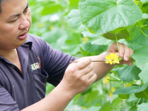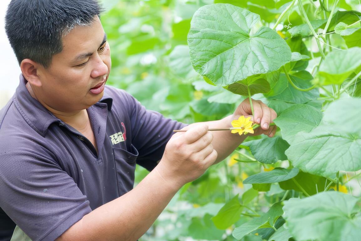 蜜蜂偷懶的結果,就是授粉不夠均勻且授粉時間不一,造成採果收成時品質落差大且成熟度不統一,沒有辦法,只能自己手工幫洋香瓜授粉,拿起畫筆當媒人扮畫家。這一天,沈二哥酷酷拿起畫筆,開始往雄花上沾點花粉,接著再把畫筆挪到雌花上塗抹均勻,動作很快,但仍可見過程中要每一朵都十分細緻檢查。