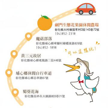 劍門生態花果園位於彰化大村鄉茄東村,透過Google空照圖往下看,整個區域就是一片滿滿稻田與農地的平原。賴家在此定居耕讀至少四代,或種稻米、或種蔬菜,從1920年起,整個員林與大村就開始遍佈柑桔,賴家也不例外,劍門先生也曾寫下:「家有千株橘」一詞。
