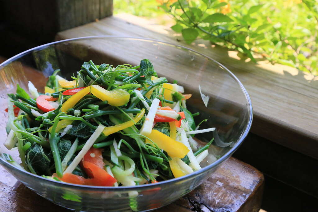 這兩項蔬菜的吃法變化還不少,但怕大家一時沒辦法決定該怎麼運用,農園也提供了參考食譜,有酥炸金針花、金針炒肉絲、涼拌龍鬚菜,以及龍鬚菜綠拿鐵。在大夥的巧手準備下,不一會兒工夫就能把美食端上桌囉。從農場到餐桌,這過程讓農療參與者與土地有更多接觸,而切菜、料理,並看到成果漸漸成形,也是讓人覺得很有療癒感的過程。