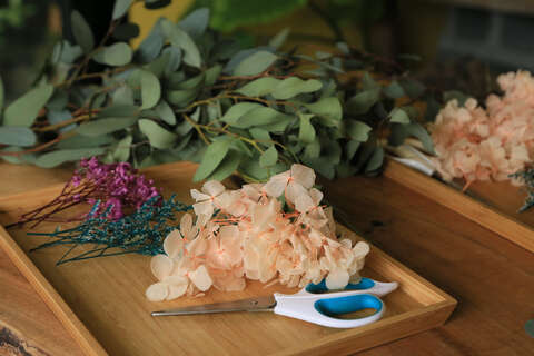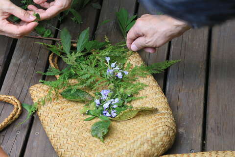 午後的關卡,則是運用農園的繡球花與由加利葉等植物,製作戴在頭上的花冠。工作人員已將這些來自農園的植物做好初步準備,部分花材還會進行乾燥處理,好讓成品能維持得更持久。