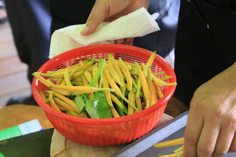 接著第二道活動,是由參加者採摘農園當季的作物:金針花與龍鬚菜,再嘗試利用它們料理一道午間佳餚。