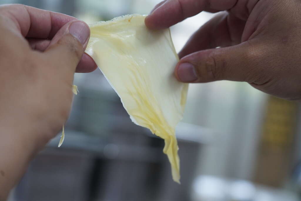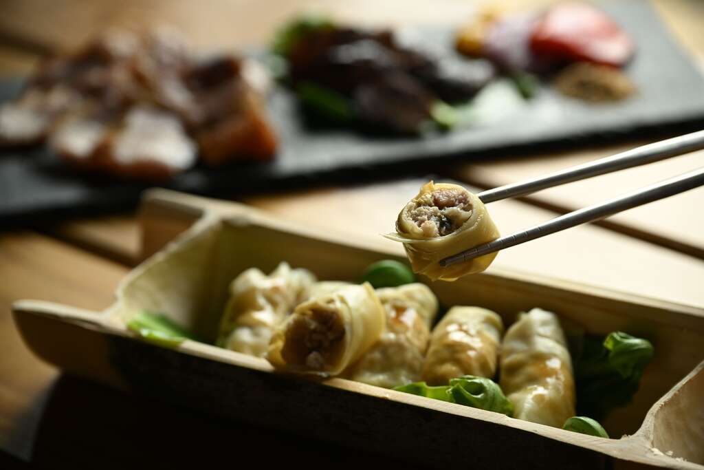 在地人經常在夏天筍季製作醃筍,去殼醃漬的外層筍皮較為粗韌,纖維明顯,吃來紮口,還好,農家就是擅長處理邊角食材,陳裔晴就以流利的動作片下薄可透光的麻竹筍筍茸用來包餡,做成手路菜「筍香卷」。