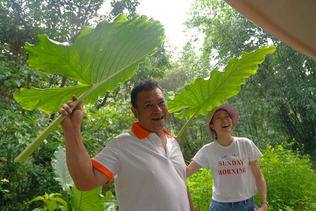 山間突然下起雨來,「田爸爸」許霹耀悠哉地摘了有大大葉片姑婆芋讓遊客打傘,畫面有點可愛捏。