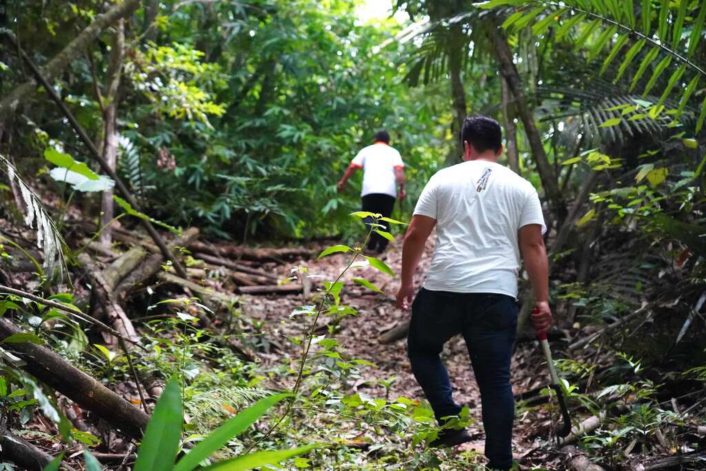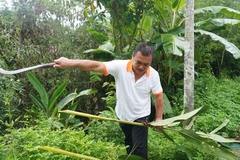 許霹耀帶大家上山採集月桃葉,「咻咻咻」砍葉子做玩具的動作有點帥。
