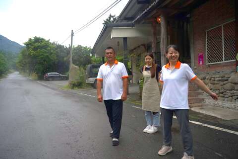 位於阿里山鄉茶山村的田媽媽餐廳「一晴食坊」,田媽媽女主角陳裔晴(右起)、女兒許衣淳和田爸爸許霹耀,全包和社區聯手帶路好吃好玩的茶山村遊程。