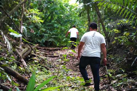 茶山村一晴食坊許霹耀(前),帶路遊客玩水、遊山及割筍,白天吃田園料理,下午進山遊玩,傍晚到營火旁回到村裡吃鄒族烤肉聊天。