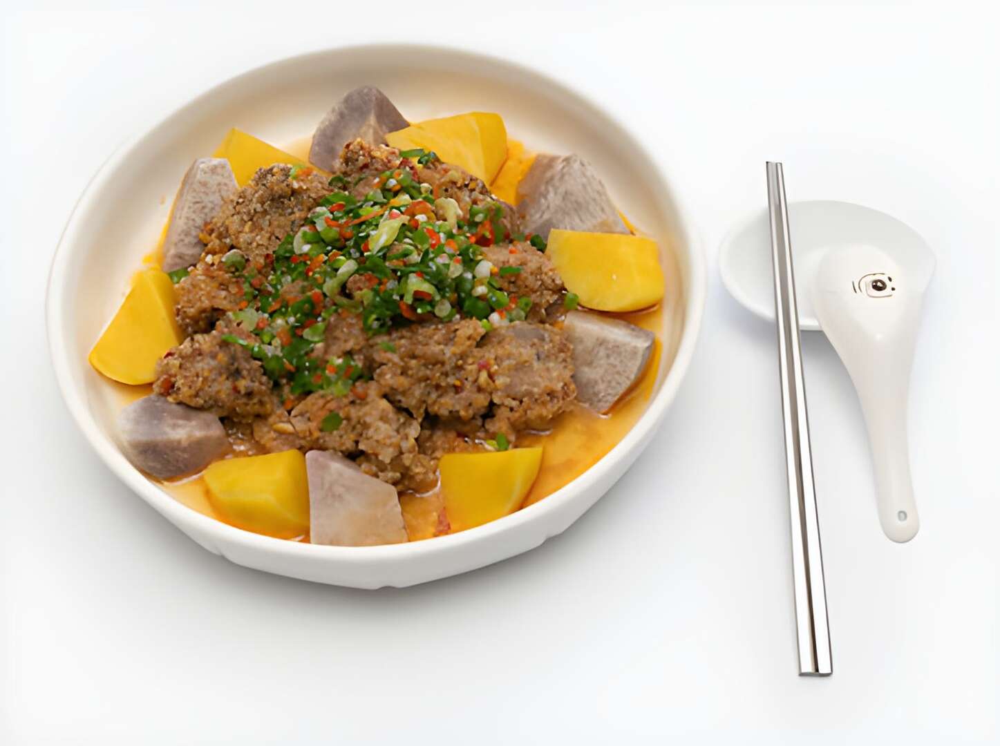 這道菜的明星還包涵給的一點也不小氣的蔥末,被淋上熱油的粉蔥激發出濃而不嗆的辛香味,俗云「北三星、南大安」,有別於宜蘭三星蔥的溫婉,大安區生產的青蔥辛辣而香氣足,年產500公噸、口感脆甜、香、嫩、辣的大安粉蔥,豐富了粉蒸排骨的味道,適度為豬排脂肉增添一股清新。