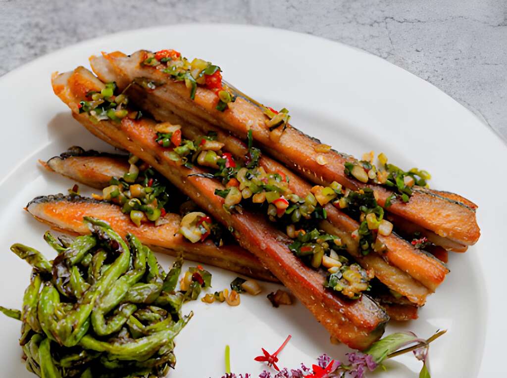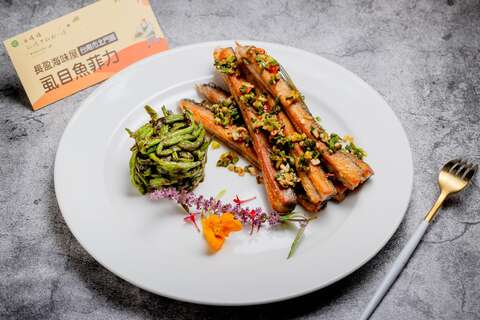 獨家熟成的虱目魚嶺,乾煎後鹹香酥脆,雖是佐酒良伴,但食用感受略顯單調。如何使顏色黑黑的魚菲力增加視覺上的刺激食慾,是有方法的,阿奎師以名菜「乾煸四季豆」和魚菲力做協調的擺盤,左右對稱,並設計了粉蔥香辣醋醬,使魚菲力口感不那麼乾硬,增添幾許柔順和風味變化。