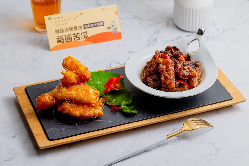精緻蔬食料理是梅居的主要訴求,廣大農場物產豐富,如何豐富福圓苦瓜的滋味並善用山區當令盛產食材是主廚挑戰,阿奎師在農場看到好幾樣品種的有機柑橘金澄澄高掛枝頭,便用中國東北地區拔絲地瓜做法,麥芽糖和砂糖煮成一片薄如蟬翼爽脆不黏牙的糖衣,和自家新鮮柑橘果肉合為一體,酸酸甜甜,糖衣的脆和果肉的柔軟非常討喜,讓福圓苦瓜更有趣也更高級。
