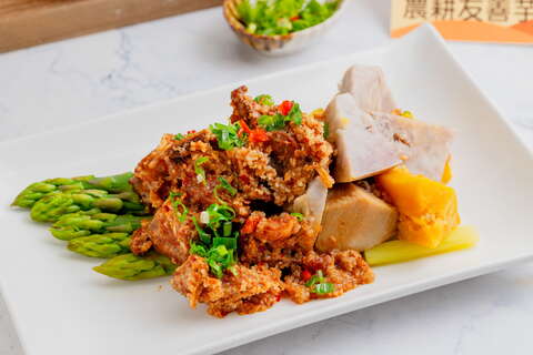 由地方上總鋪師耆老所傳授的粉蒸芋頭排骨,以中區冠軍芋頭和產銷履歷的小排骨墜道料理的靈魂,並用被熱油激香的大安蔥強化整體香氣,是道完成度高的好料理,惟澱粉和蛋白質足夠,但蔬菜類營養和顏色稍嫌不足,中部也是本土盧筍主要生產地,阿奎師現場指導以大根質佳台灣綠蘆筍整支在鍋內煎熟後,鋪在芋頭粉蒸排骨底部,擺盤時刻意顯現出蘆筍的漂亮筍尖,味道更討喜,也更好看更有質感。