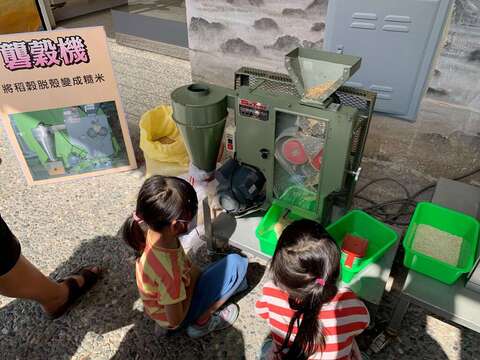 在冬山良食農創園區可以操作礱穀機將稻米脫殼