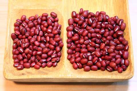 高雄8號(左)顆粒較小,適合製作紅豆餡。高雄9號(右)顆粒大且渾圓適合煮紅豆湯等用途