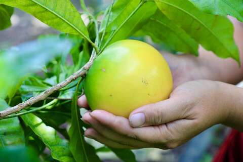 黃金果多年前引進台灣後,一開始從種子繁衍,實生苗品質起起伏伏,但近年已培育出優質品種,左岸幸福莊園的黃金果就是特別挑選的品種,黃金大果口感滑順膠質濃厚,目前也賣得極好,頗受歡迎。