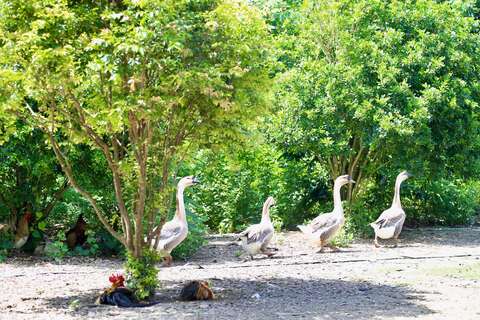 當年因為堅持有機種植,卻又除草除得很累,因此聽從專家建議養了鵝來吃草,目前鵝群已繁衍出3個小隊共20多隻。果然,鵝會幫忙吃草,但鵝更愛黃金果。酪梨還好,因為它通常是後熟,掛樹上時都還綠綠的鵝不愛。但黃金果不用全熟,對鵝來說就已經超級好吃,於是這些鵝總是一找到空檔,就會火速奔往黃金果園區,一口就能啄下,然後一顆黃金果不用20秒就群聚吃光,只留主人看著鵝的笑臉無語問蒼天。