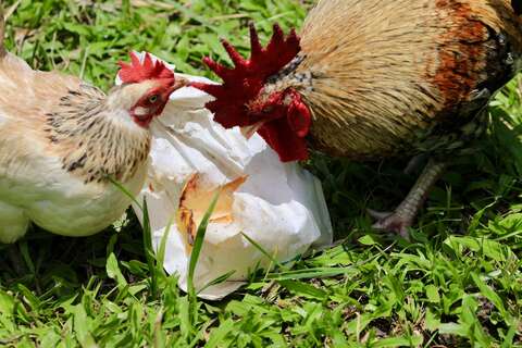 左岸幸福莊園養了許多鵝來幫忙吃草,養雞幫忙吃蟲,結果牠們都特愛黃金果,常搶著吃,形成可愛畫面。