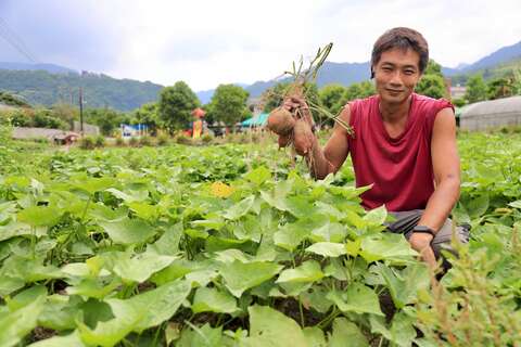 金山汪汪地瓜園第三代農場主人賴家龍與剛出土的紅皮地瓜。