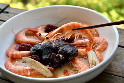 除了鍋物,餐桌上還能見到靈芝入饌巧思,像是「靈芝醉蝦」,利用靈芝浸泡的酒液來提味,讓海鮮帶著清新的草本香;「靈芝香筍元寶餃」則餡料混合竹筍與豬肉,象徵聚財的吉祥寓意。