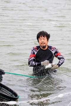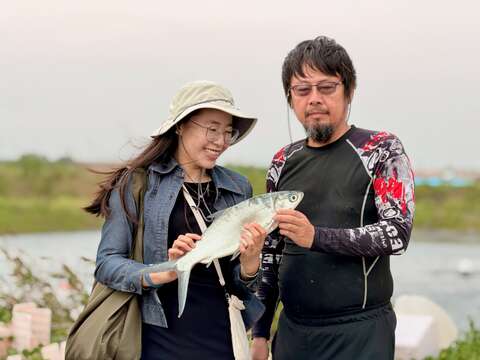 長盈海味屋第三代謝佳歆與剛從流刺網取下的虱目魚
