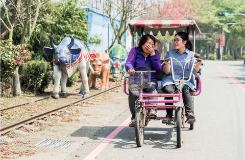 騎乘四人協力車遊南笨港休區,途經海賊庄休閒農場、復興鐵橋、剪黏大壁畫等多處景點,再體驗1公分馬賽克創意拼貼,午餐享用農村好物胡麻油及嘉義優鮮的麻油薑泥,自己動手拌炒麻油雞腿鍋後,再加入陽光郊遊社日曬Q彈手工麵線