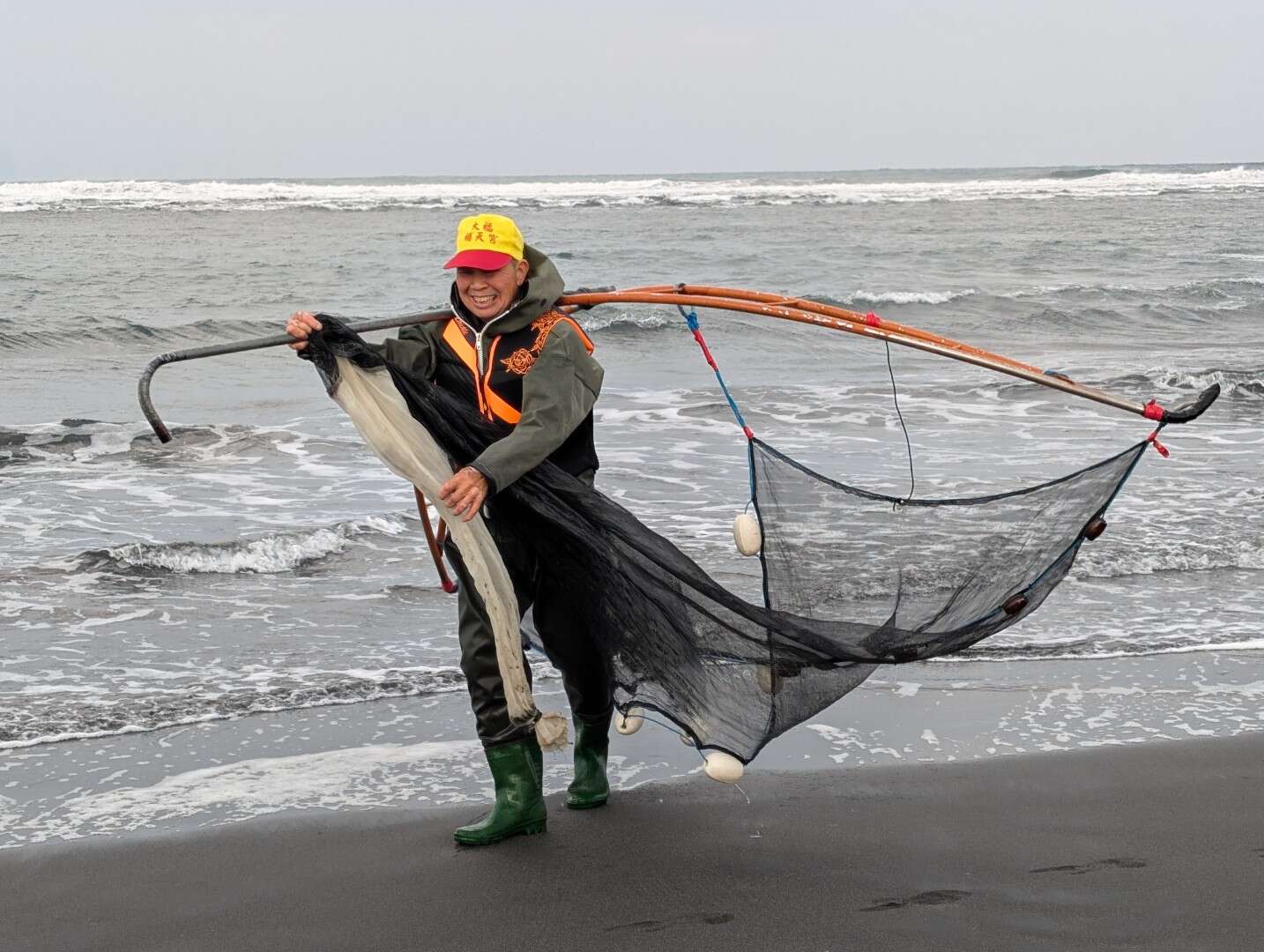 沉重的手拖網也稱作弓形網,未下水時重量已不可小覷,僅能利用槓桿原理將捕撈器具扛起。(圖中為大家示範如何捕鰻的人為林芷晴的阿公阿富伯)